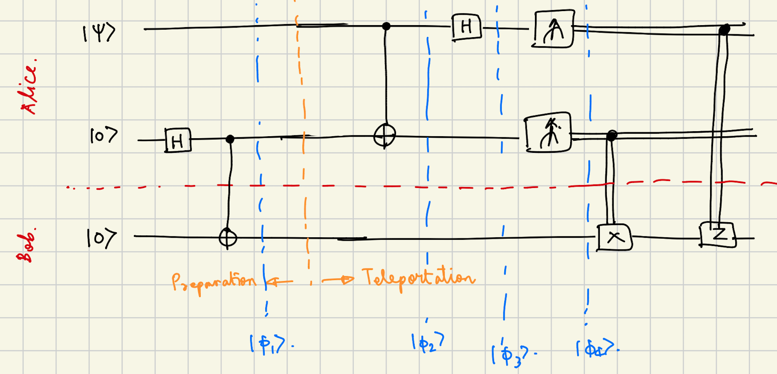 Initial state: $$|\phi_1\rangle = |\psi\rangle \otimes \frac{1}{\sqrt{2}}(|00\rangle + |11\rangle)$$