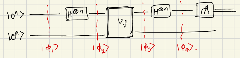 After $U_f$: $$\begin{align*} |\phi_3\rangle &= \frac{1}{\sqrt{2^n}}\sum_{x \in {0,1}^n}|x\rangle \otimes |f(x)\rangle \end{align*}$$