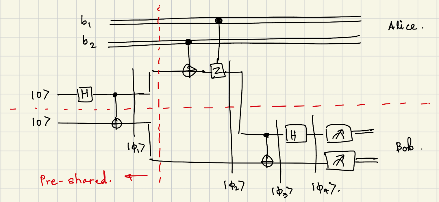 - $b_1 = 1$: Apply $Z$ (phase flip) on first qubit
